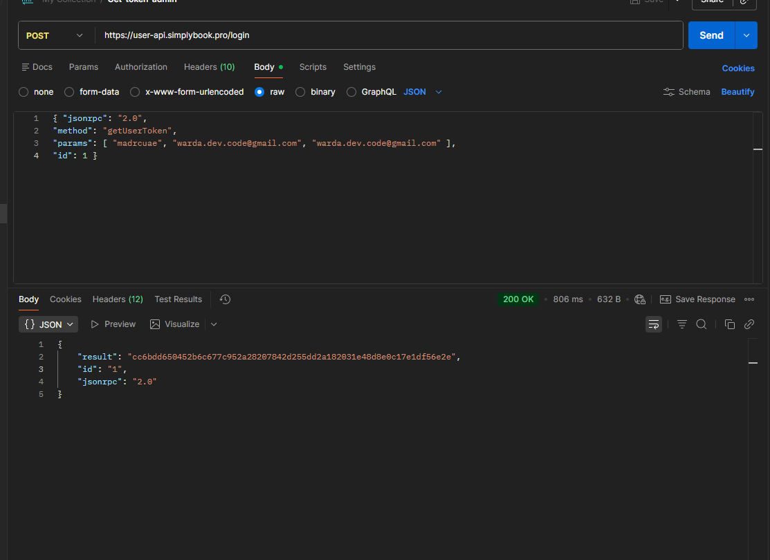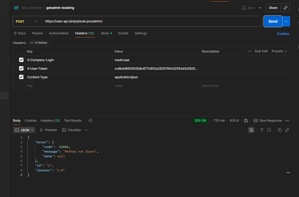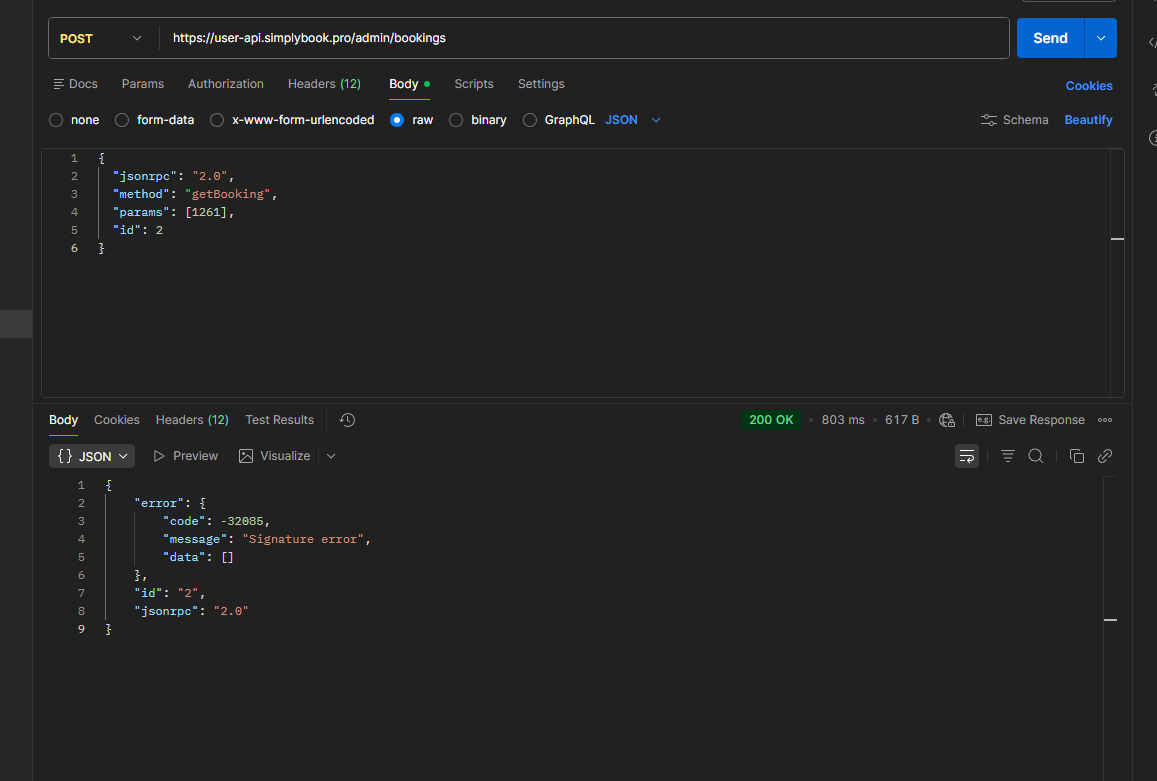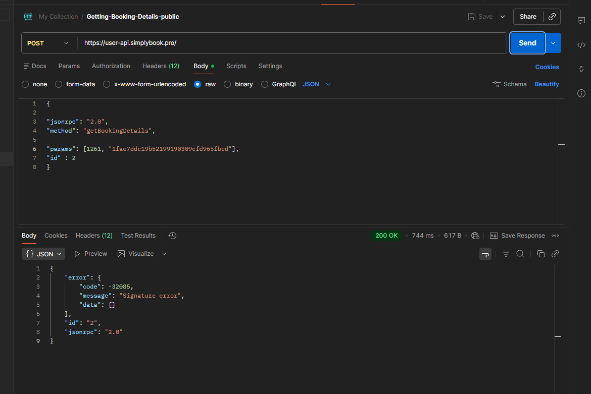 I would really appreciate it if you could please share the exact API routes and endpoints for fetching booking details via email in SimpleBook, and also guide me on how you are testing them in Postman. If possible, please provide a screenshot or a short explanation of how you are sending the request in Postman (including method type, headers, body, etc.) so that I can at least retrieve one booking successfully and confirm whether the issue is technical on my side or from your end.