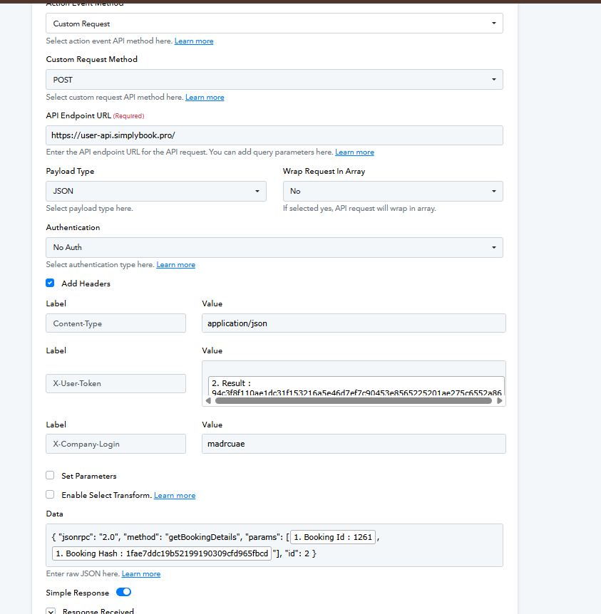 Body: The Admin API’s method is getBooking (not getBookingDetails) and it only requires the Booking ID. It does not require the booking hash.